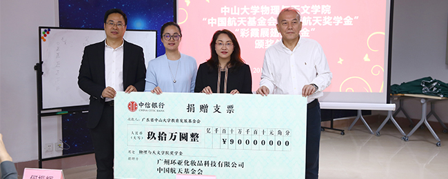 “中國航天基金會-環亞航天獎學金”由環亞集團捐資設立,用以獎勵中山大學物理與天文學院及學校航天方向品學兼優、全面發展的同學,激勵學生勤奮學習、大膽創新、努力進取,成為航天事業棟梁之才。